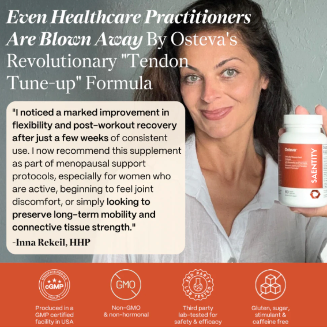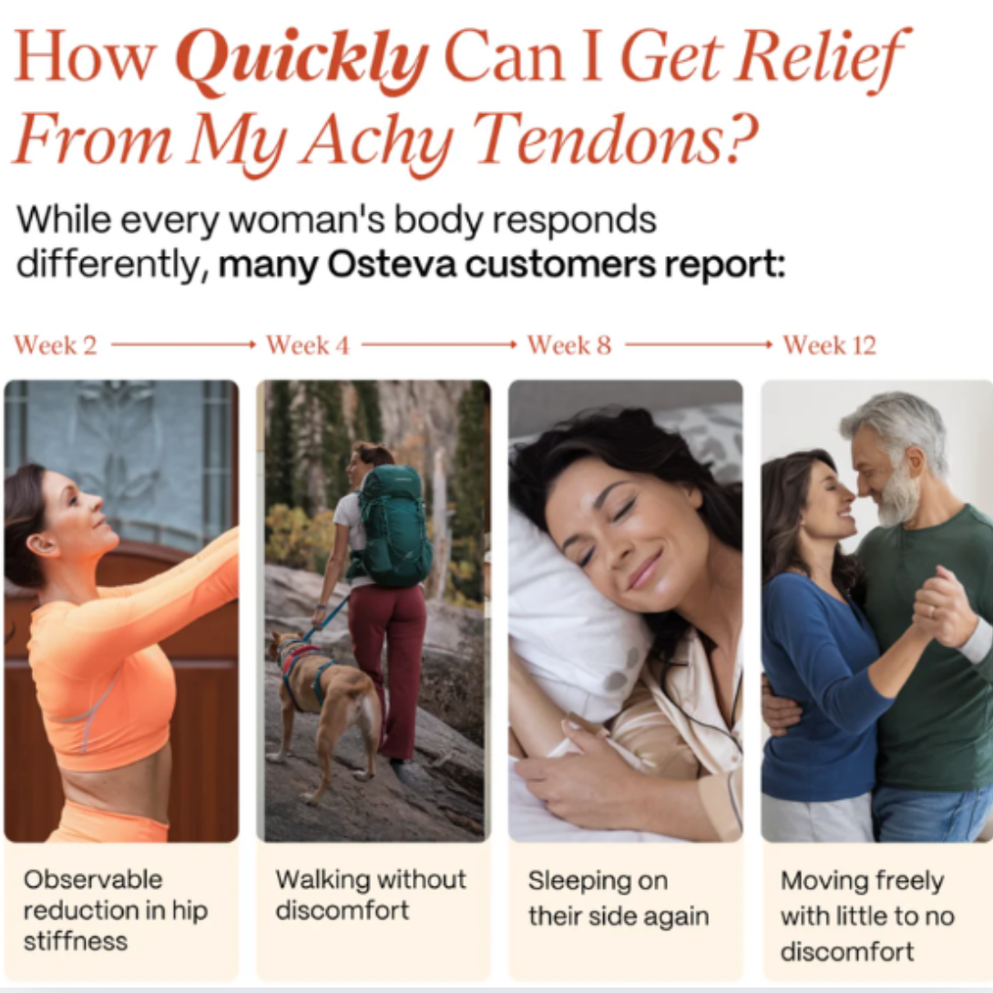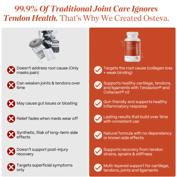 Unlike traditional joint-care methods that just mask symptoms, Osteva targets the root cause of discomfort by replenishing the structural proteins and nutrients your tendons need to be healthy in your 40s and beyond