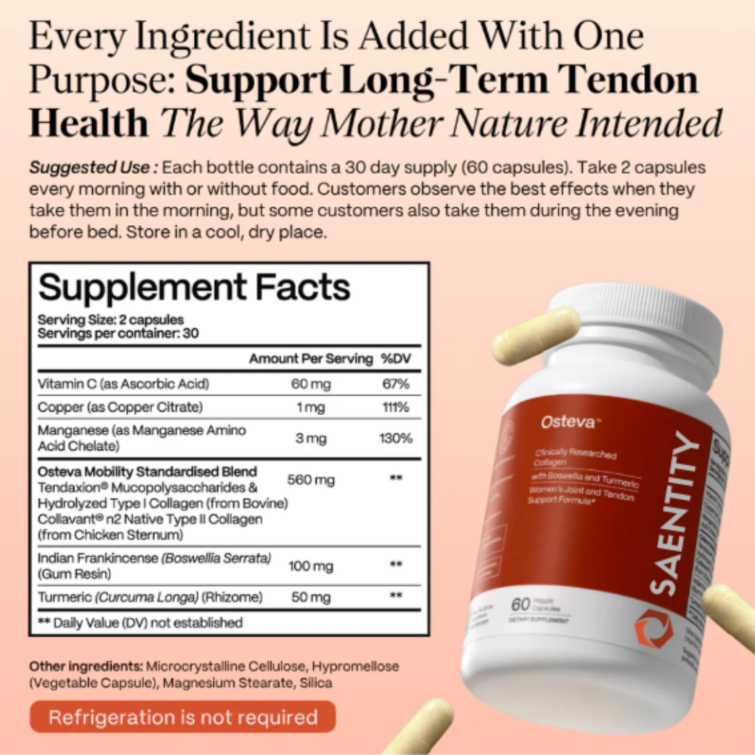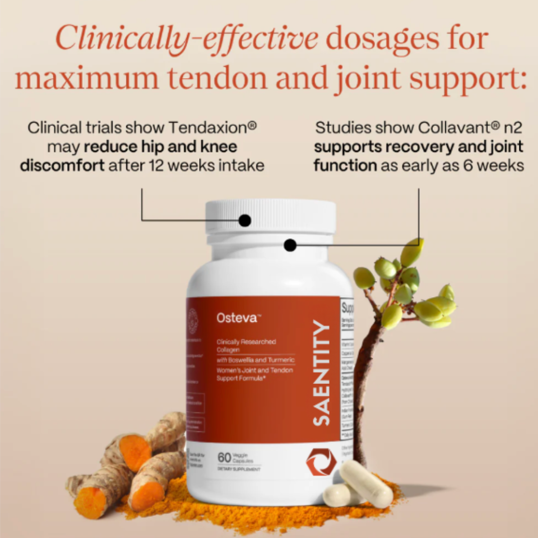 Osteva™ contains a clinically-studied dose of Tendaxion® - a combination of Hydrolyzed Type I collagen and Mucopolysaccharides, which has been studied to naturally support healthy tendon and ligament function.