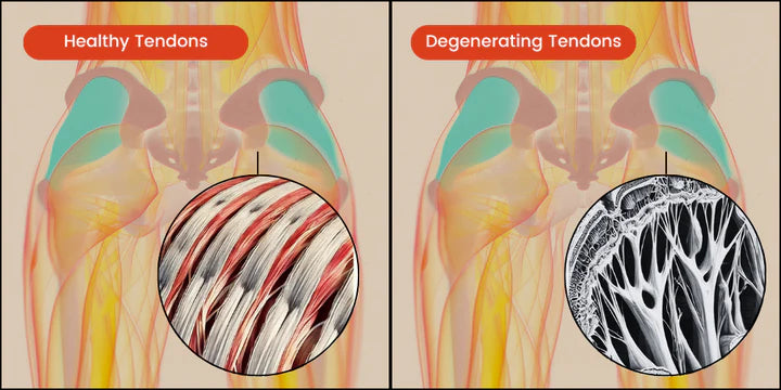 Low collagen production causes tendons to become weaker and stiffer over time. The tell-tale sign is a deep, radiating ache in the hips and knees.